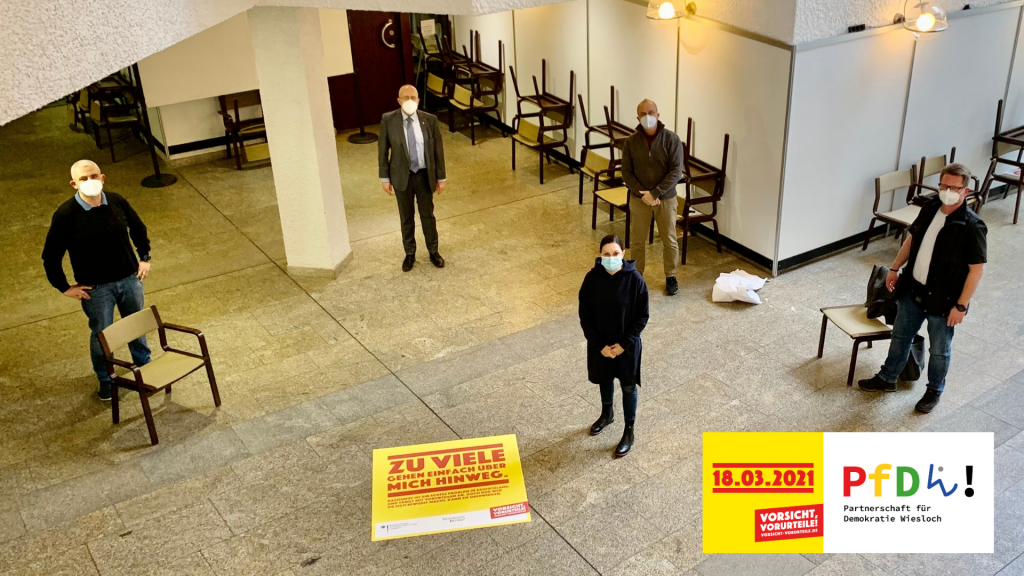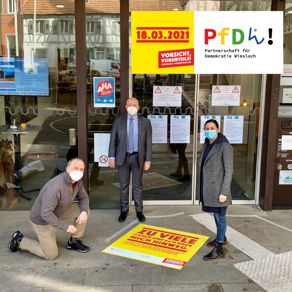 Anlässlich des Aktionstags am 18.3.2021 setzt die Partnerschaft für Demokratie Wiesloch ein Zeichen gegen Alltagsrassismus. Die Vorsicht-Vorurteile-Aufkleber vor dem Haupteingang des Rathauses und im Laufe der Woche auch in der Wieslocher Fußgängerzone sollen auf Alltagsrassismus in unserer Gesellschaft hinweisen und zum Nachdenken aufrufen.