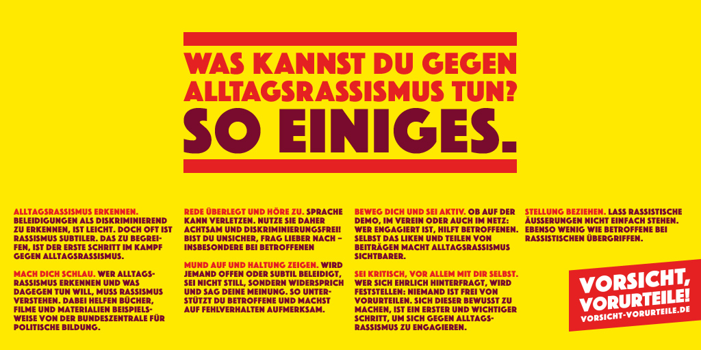 Mehr Informationen und was Sie im Alltag gegen Vorurteile tun können, finden Sie auf der Website www.vorsicht-vorurteile.de des Bundesprogramms „Demokratie leben!“.