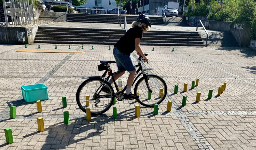 Spur halten, Kreisfahren, die S-förmige Klötzchenbahn und das Schrägbrett erforderten großes Geschick. Zum Abschluss des Parcours war eine Links-Rechts-Kombination mit Schulterblick und Richtungswechsel anzeigen sowie ein kleiner Slalom mit Bremstest auf Zeit angesagt.