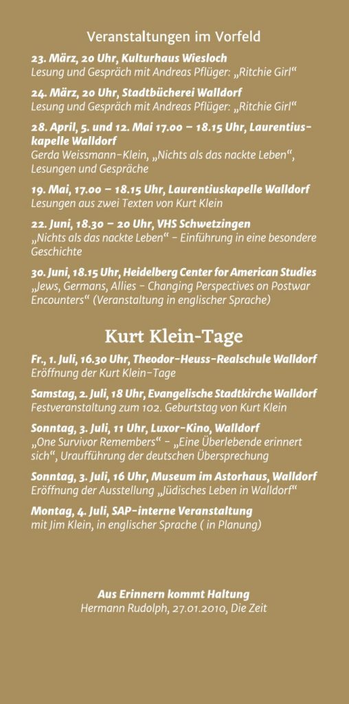 Kurt Klein, 1920 in Walldorf geboren, musste als Jude Deutschland 1937 verlassen. Von den USA aus versuchte er vergeblich, seine Eltern bei ihrer Flucht zu unterstützen. Das misslang. Ludwig und Alice Klein wurden, nach zwei Jahren in Gurs, 1942 vermutlich in Auschwitz ermordet. Kurt kam als amerikanischer Soldat („Ritchie Boy“) 1944 nach Europa zurück und traf am Kriegsende in der Nähe von Regensburg auf die deutsch-polnische Jüdin Gerda Weissmann, die, nach mehr als zwei Jahren Arbeitslager und einem monatelangen Todesmarsch, völlig entkräftet war. Kurt Klein unterstützte sie, die beiden verliebten sich, heirateten 1946 in Paris und lebten dann in den USA.