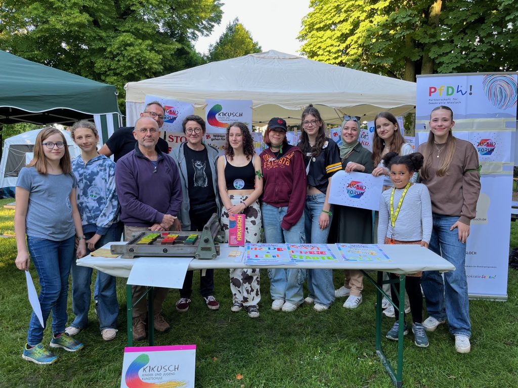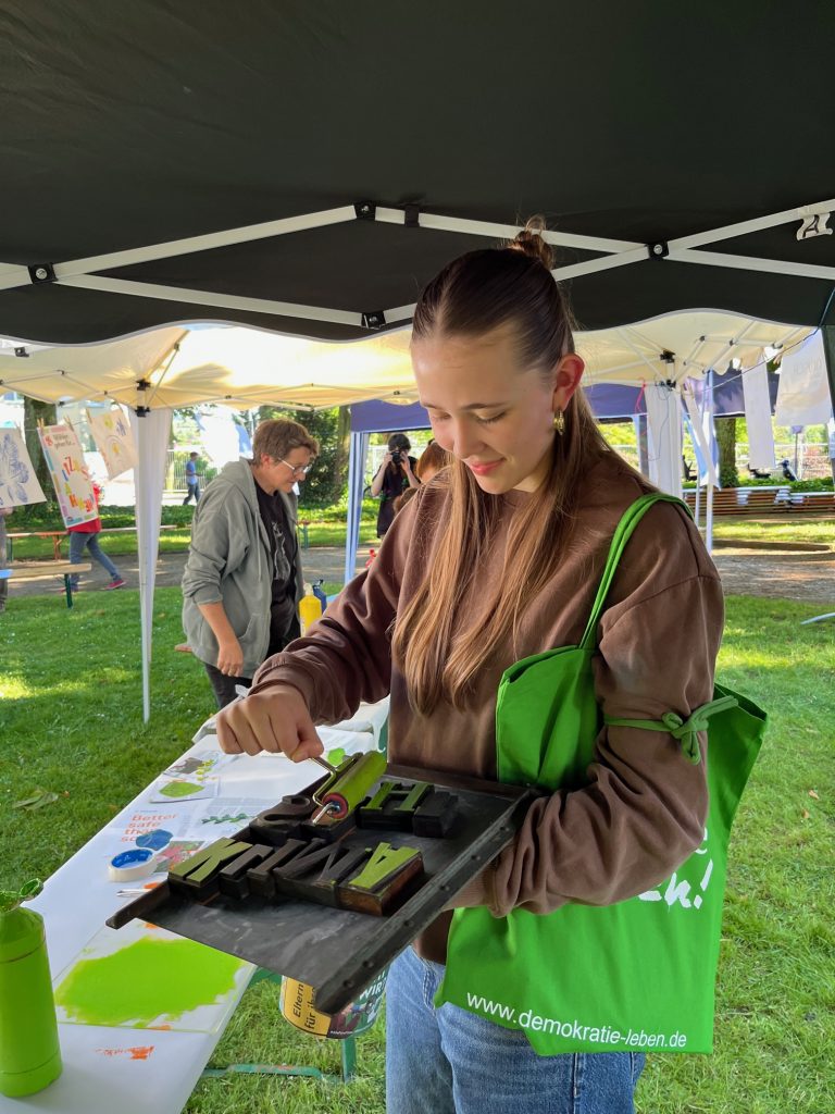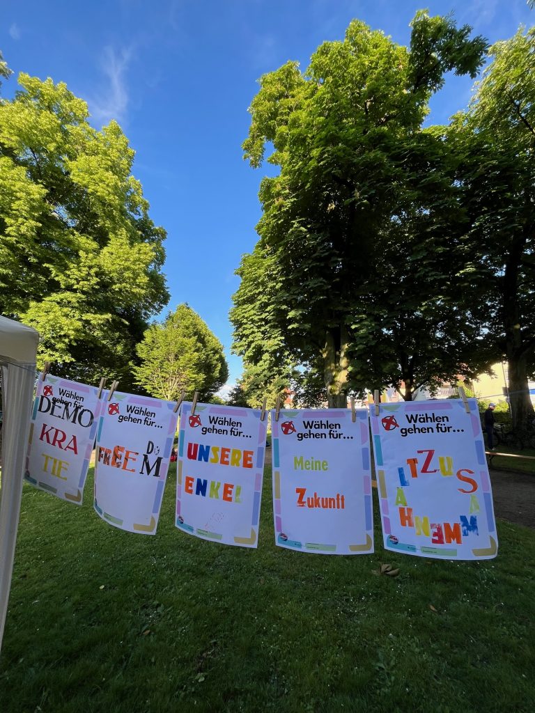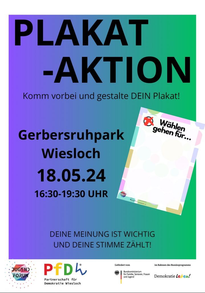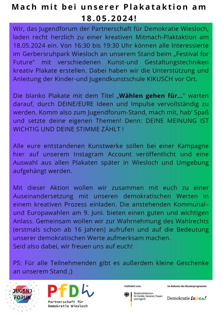 am 18.05.2024 luden wir zu einer kreativen Mitmach-Plaktaktion ein. Von 16:30 bis 19:30 Uhr konnten alle Interessierte im Gerbersruhpark Wiesloch an unserem Stand beim „Festival for Future“ mit verschiedenen Kunst- und Gestaltungstechniken kreativ Plakate erstellen. Dabei wurden wir von der Kinder- und Jugendkunstschule KIKUSCH angeleitet und unterstützt. Die blanko Plakate mit dem Titel „Wählen gehen für…“ warteten darauf, durch DEINE/EURE Ideen und Impulse vervollständigt zu werden. Viele sind zu unserem Stand gekommen und haben mit viel Kreativität und Spaß ihre Themen ins Bild gesetzt.